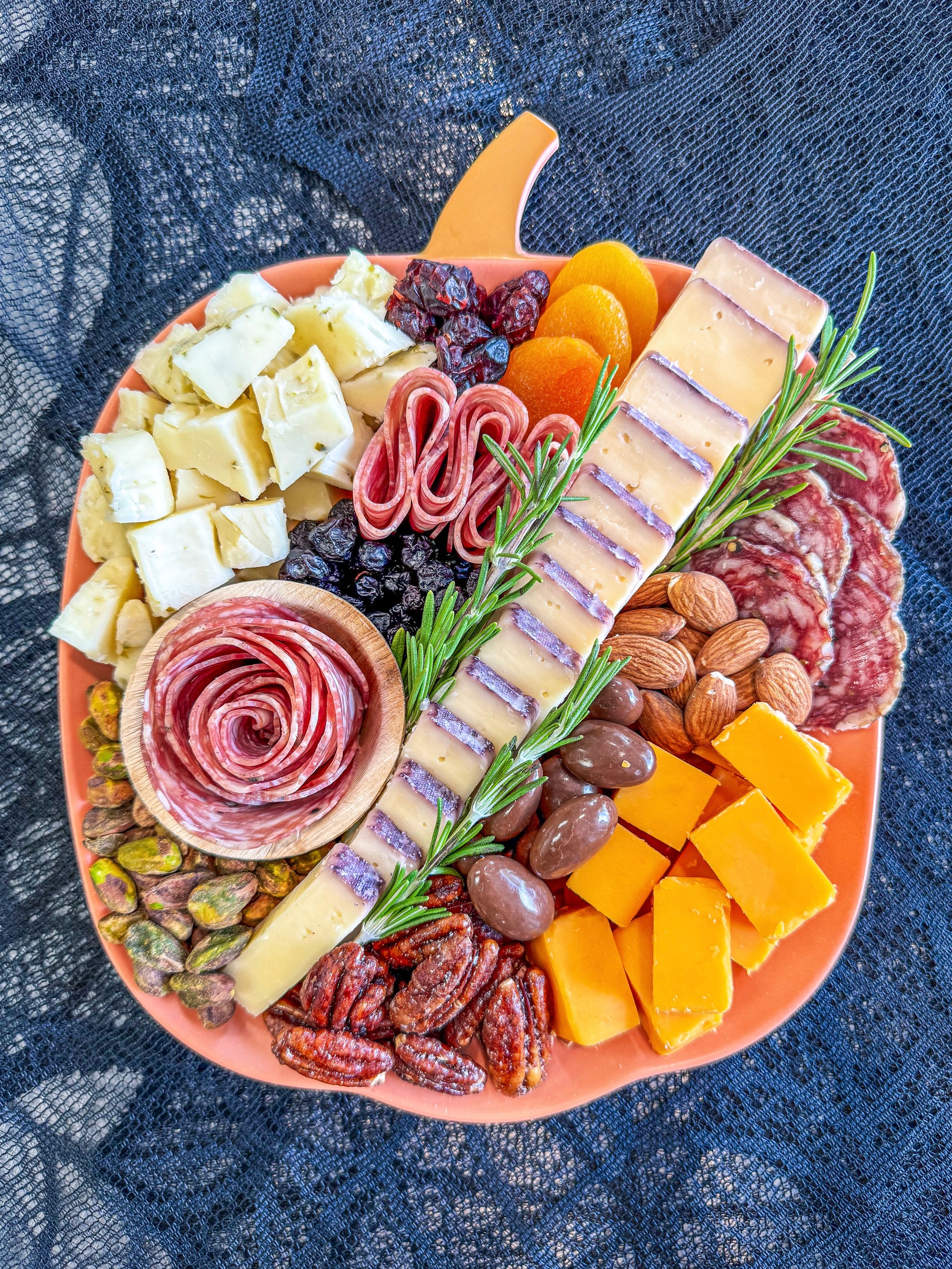 Bring this adorable pumpkin-shaped cheese board to your Halloween party this year!